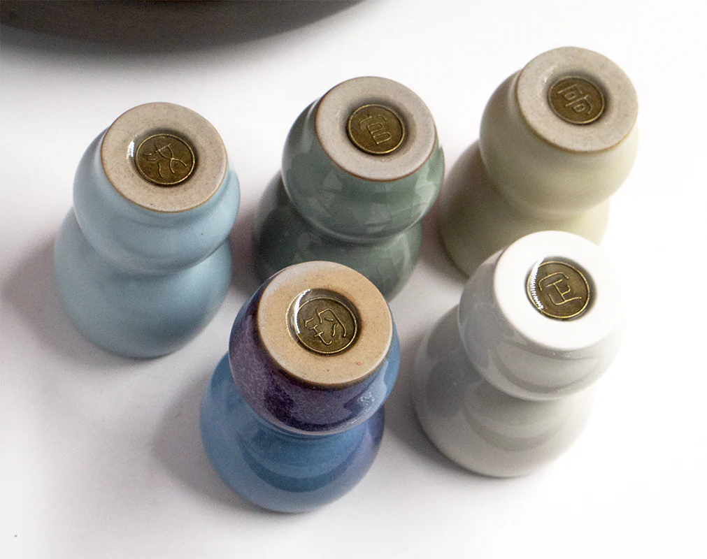 Each of the 5 shot glasses are named after one of the Five Famous Kilns of the Song Dynasty. With a different master in porcelain craft supervising each design, they all bear unique characteristics inspired by their namesake. The name of each cup is inlaid in bronze at their base—Ru, Guan, Ge, Jun, and Ding.